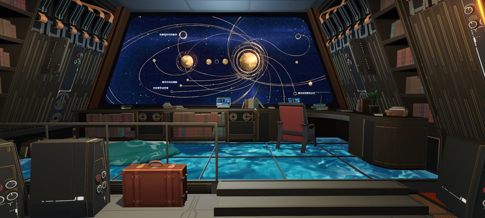 [ with a tug to his hand, he leads zhongli through the parlor car, the pneumatic doors hissing to allow them to pass into the next car, where a narrow corridor lined with more windows leads to many doors along the left. the first door is where dan heng stops, pressing the button that allows it to slide open. inside is a medium sized room lined with blinking servers that hum quietly. a space chart takes up most of the far wall, and beside a desk there is a section of floor that glows and undulates, mimicking the sea. in a corner is a pile of blankets and pillows. ]